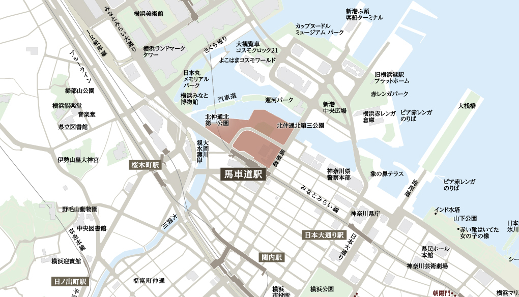 北仲地区は横浜の歴史・文化を誇る関内地区とみなとみらい21地区の結節点に位置。JR・横浜市営地下鉄「桜木町」駅から東に500mで、みなとみらい線「馬車道」駅に隣接しています。南は広域幹線道路「栄本町線」に接し、北・西は大岡川河口に面しています。古来より陸地であり、開港当初よりウォーターフロントであった当地区は、永きにわたって歴史を積み重ねてきたエリアです。