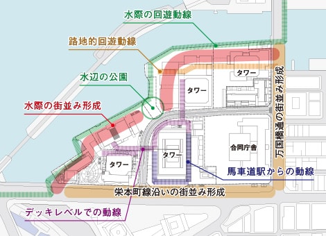 多様な魅力を持った歩行者ルートと広場空間を整備し、馬車道駅と水際空間および、北仲地区と周辺市街地のつながりを強化します。